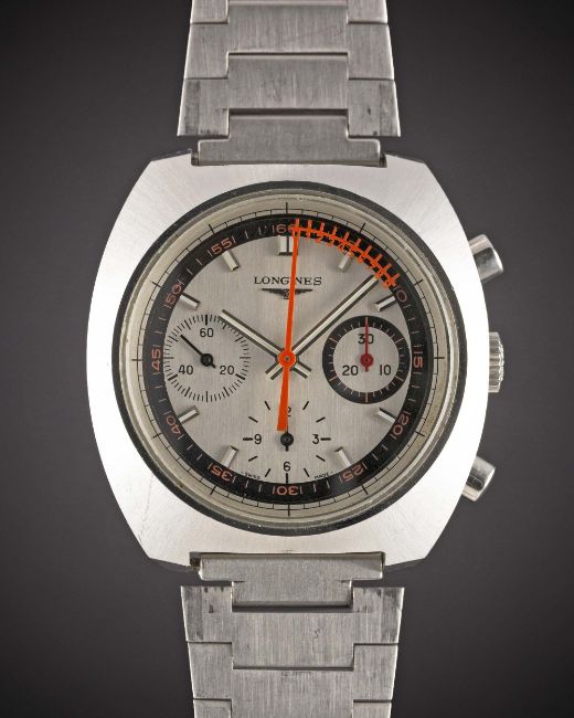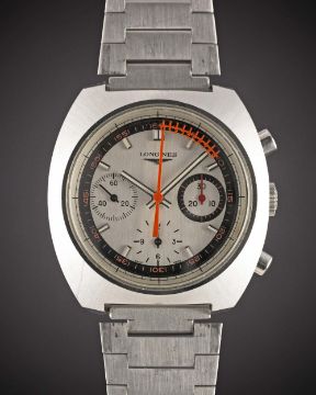 A GENTLEMAN'S STAINLESS STEEL LONGINES NONIUS CHRONOGRAPH BRACELET WATCHDATED 1972, REF. 8271 2 WITH ORANGE 1/10TH SECOND CENTRE CHRONOGRAPH HAND, ACCOMPANIED BY A COPY OF EMAIL CORRESPONDENCE FROM LONGINES BRAND HERITAGE CONFIRMING ORIGINAL DELIVERY TO ITALY IN OCTOBER 1972, TO THEIR AGENT BINDAMovement: 17J, manual wind, cal. 330, Valjoux base cal. 72, signed Longines.Case: Width approx. 39mm, screw back, signed Longines, numbered, Longines crown.Bracelet: Longines stainless steel bracelet.CONDITION REPORTDial: Original dial in excellent condition.Movement: Working at present.Case: In excellent condition, with some small scratches due to general use.Strap/Bracelet: In excellent condition, with some light scratches due to general use.