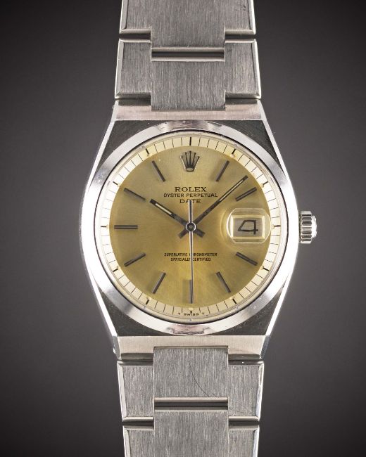 A RARE GENTLEMAN'S STAINLESS STEEL ROLEX OYSTER PERPETUAL DATE BRACELET WATCHCIRCA 1977, REF. 1530 WITH SILVER DIAL SHOWING A "CHAMPAGNE" PATINAMovement: 26J, automatic chronometer, cal. 1570, signed Montres Rolex S.A., numbered.Case: Diameter approx. 36mm, Oyster case, signed Montres Rolex S.A., numbered 5,1xx,xxx, smooth bezel, sapphire crystal, Rolex crown.Bracelet: Original Rolex Oyster bracelet, numbered 96660.CONDITION REPORTDial: Original dial in very good condition, showing a "champagne" patina.Movement: Working at present.Case: In excellent condition, with some light scratches due to general use.Strap/Bracelet: In very good condition, with some small scratches due to general use.