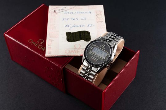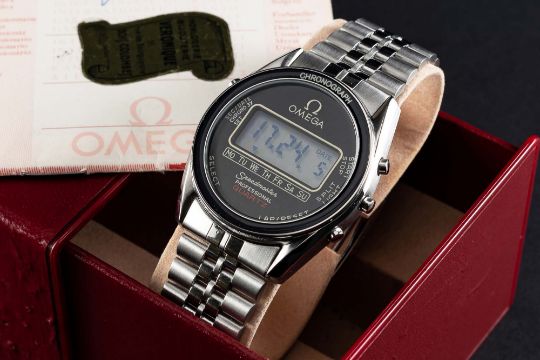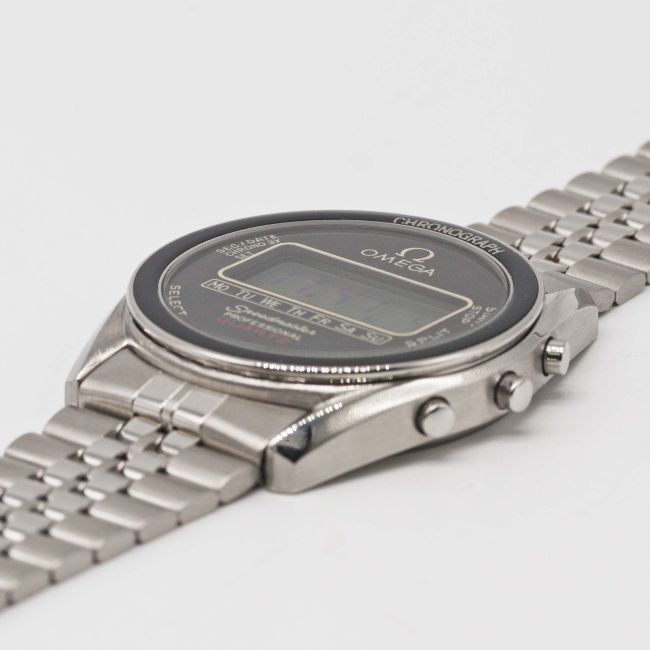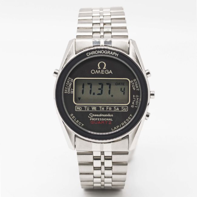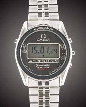 A RARE GENTLEMAN'S STAINLESS STEEL OMEGA SPEEDMASTER QUARTZ LCD CHRONOGRAPH BRACELET WATCHDATED 1983, REF. 186.0004 WITH ORIGINAL BOX & GUARANTEEMovement: Quartz, cal. 1620, numbered 39,xxx,xxx.Case: Diameter approx. 36.5mm, snap back, Seamaster emblem embossed on case back, signed Omega Watch Co, acrylic bezel.Bracelet: Original Omega Speedmaster bracelet, numbered ST.1305.741.(42).CONDITION REPORTDial: Original dial in excellent condition.Movement: Working at present.Case: In excellent condition.Strap/Bracelet: In excellent condition, with some light scratches due to general use.