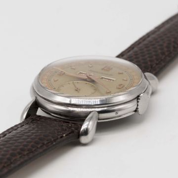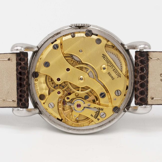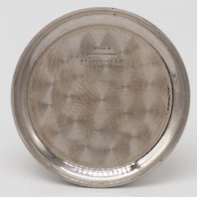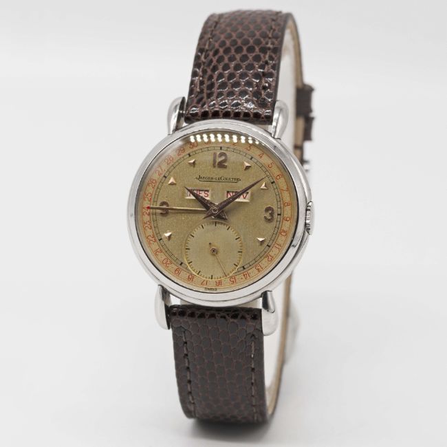 A GENTLEMAN'S STAINLESS STEEL JAEGER LECOULTRE TRIPLE CALENDAR WRIST WATCHCIRCA 1940s, WITH ROSE GOLD DAUPHINE HANDS & "PYRAMID" MARKERS Movement: Manual wind, cal. P484/1A, signed Jaeger-LeCoultre, numbered 51x,xxx.Case: Diameter approx. 33mm, "tear drop" lugs, snap back, signed LeCoultre Co, numbered 41x,xxx.Strap: Leather.CONDITION REPORTDial: Original dial in good condition, showing small signs of age.Movement: Working at present.Case: In excellent condition, with some light scratches due to general use.Strap/Bracelet: In excellent condition.