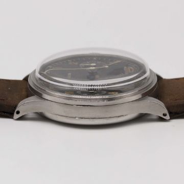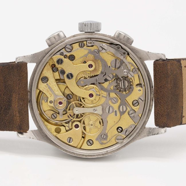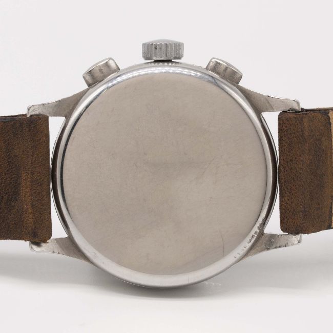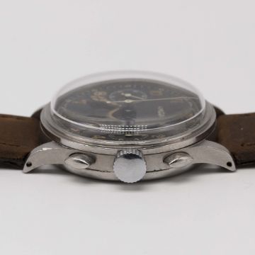 A RARE GENTLEMAN'S LARGE SIZE STAINLESS STEEL LEMANIA 15TL CHRONOGRAPH WRIST WATCHCIRCA 1940, WITH GLOSS BLACK DIAL & STEPPED BEZELMovement: Manual wind, cal. 15TL, numbered.Case: Diameter approx. 37mm, snap back, numbered, "olive" pushers.Strap: Leather.CONDITION REPORTDial: Original dial in very good condition, showing some signs of age.Movement: Working at present.Case: In very good condition, with some small scratches due to general use.Strap/Bracelet: In excellent condition.