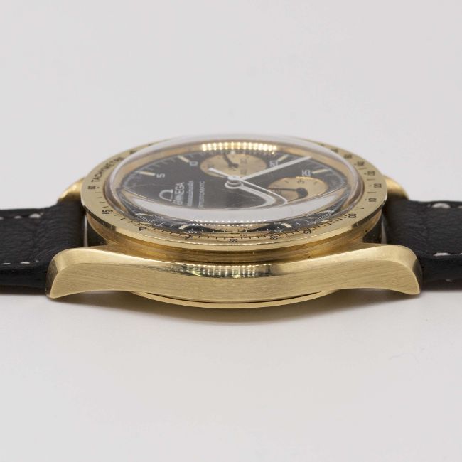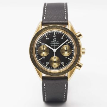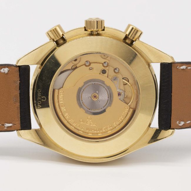 A GENTLEMAN'S 18K SOLID GOLD OMEGA SPEEDMASTER AUTOMATIC CHRONOGRAPH WRIST WATCHCIRCA 1990sMovement: 46J, automatic, cal. 1140, signed Omega.Case: Diameter approx. 39mm, exhibition back, signed Omega, numbered, 18k hallmarks, tachymetre bezel, Omega crown.Strap: Leather strap with gold plated Omega pin buckle.CONDITION REPORTDial: Original dial in excellent condition.Movement: Working at present.Case: In excellent condition, with some small scratches due to general use.Strap/Bracelet: In excellent condition.