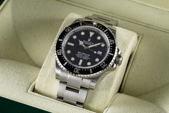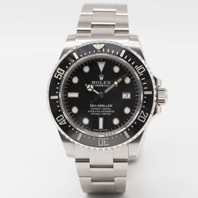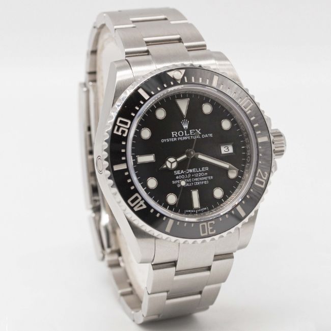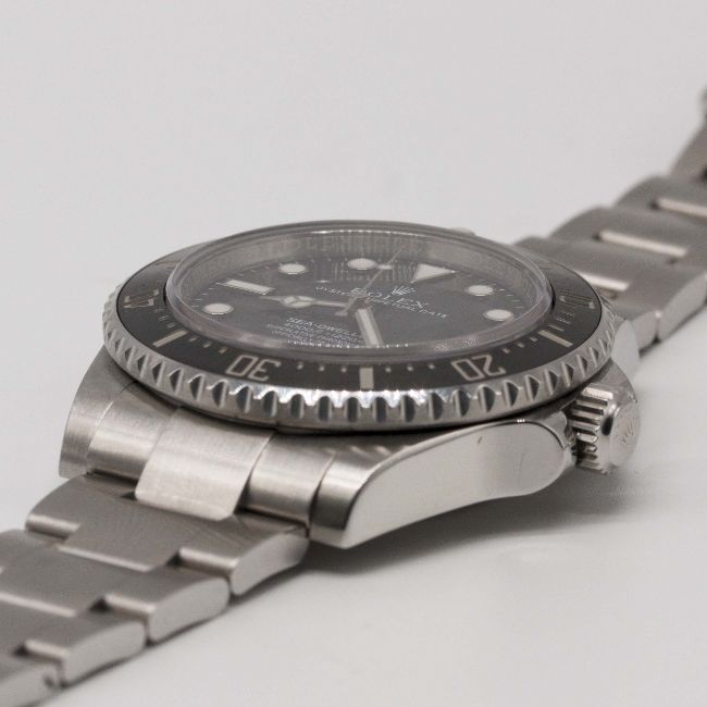 A GENTLEMAN'S STAINLESS STEEL ROLEX OYSTER PERPETUAL DATE SEA DWELLER 4000 BRACELET WATCHDATED 2014, REF. 116600 ONLY PRODUCED FOR THREE YEARS, ACCOMPANIED BY THE ORIGINAL BOX, GUARANTEE CARD & BOOKLETSMovement: Automatic chronometer, cal. 3135, signed Rolex, numbered.Case: Diameter approx. 40mm, Oyster case, signed Rolex, numbered, fully graduated 60 minute Cerachrom rotating bezel, gas escape valve, Rolex triplock crown.Bracelet: Original Rolex Oyster Sea-Dweller bracelet.CONDITION REPORTDial: Original dial in excellent condition.Movement: Working at present.Case: In excellent condition, with some light surface scratches due to occasional use.Strap/Bracelet: In excellent condition, with some light surface scratches due to occasional use.