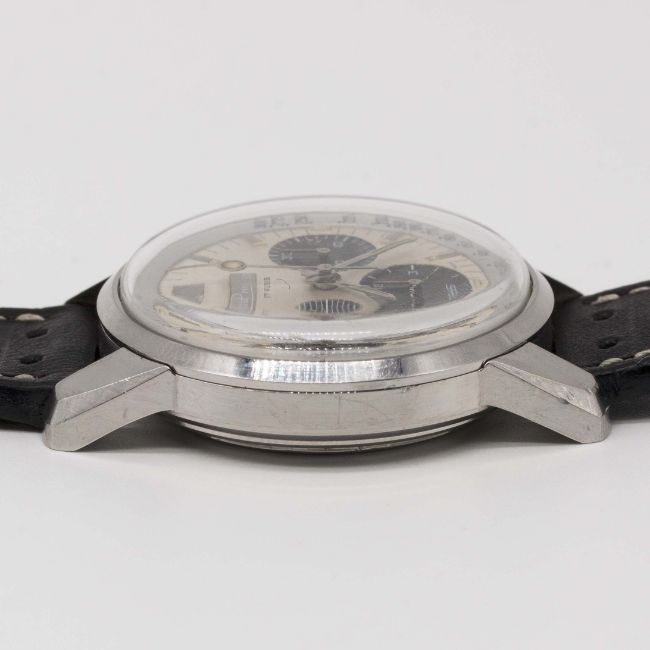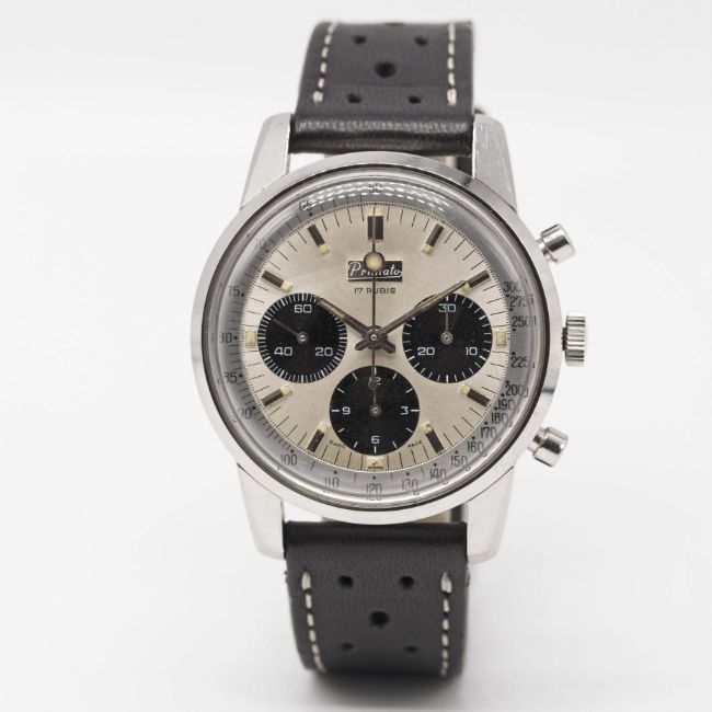 A GENTLEMAN'S STAINLESS STEEL PRIMATO "SHERPA GRAPH" CHRONOGRAPH WRIST WATCH CIRCA 1968, WITH "PANDA" DIAL & "LOLLIPOP" SECONDS HAND Movement: 17J, manual wind, Valjoux cal. 72. Case: Diameter approx. 40mm, screw back, numbered.Strap: Perforated leather.  CONDITION REPORTDial: Original dial in excellent condition, showing some small signs of age. Movement: Working at present. Case: In excellent condition, with some small scratches due to general use. Strap/Bracelet: In excellent condition.