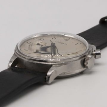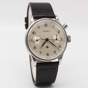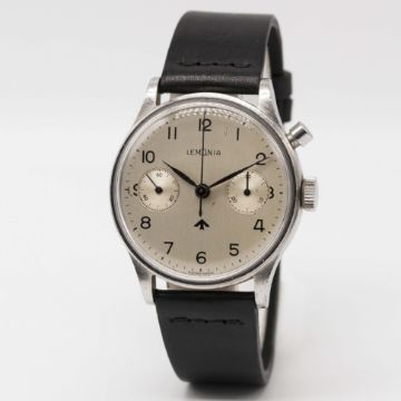 A RARE GENTLEMAN'S STAINLESS STEEL BRITISH MILITARY ROYAL NAVY NUCLEAR SUBMARINE LEMANIA SINGLE BUTTON CHRONOGRAPH WRIST WATCHCIRCA 1950s, REF. 28 ET, "FIRST SERIES" ISSUED TO ROYAL NAVY PERSONNEL ONBOARD NUCLEAR SUBMARINESMovement: 17J, manual wind, cal. 2220, signed Lemania Watch Co, numbered.Case: Diameter approx. 38mm, screw back, maker's mark HF, issue markings 0552/924-3312 ^ 81193.Strap: NATO.The dials & hands on these watches did not contain any luminous material which therefore could not interfere with radiation detectors onboard (giving false positive readings).CONDITION REPORTDial: Original dial in excellent condition, showing some small signs of age.Movement: Working at present.Case: In good condition, with small scratches due to general use.Strap/Bracelet: In excellent condition.