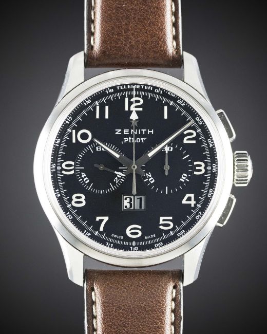 A GENTLEMAN'S STAINLESS STEEL ZENITH PILOT BIG DATE SPECIAL CHRONOGRAPH WRIST WATCHDATED 2014, REF. 03.2410.4010 WITH ORIGINAL BOX, PAPERS & BOOKLETSMovement: 31J, automatic, El Primero cal. 4010, signed Zenith, numbered.Case: Diameter approx. 42mm, exhibition back, signed, numbered, Zenith crown.Strap: Zenith leather strap & deployment clasp.CONDITION REPORTDial: Original dial in excellent condition.Movement: Working at present.Case: In excellent condition, with some light scratches due to occasional use.Strap/Bracelet: In excellent condition.