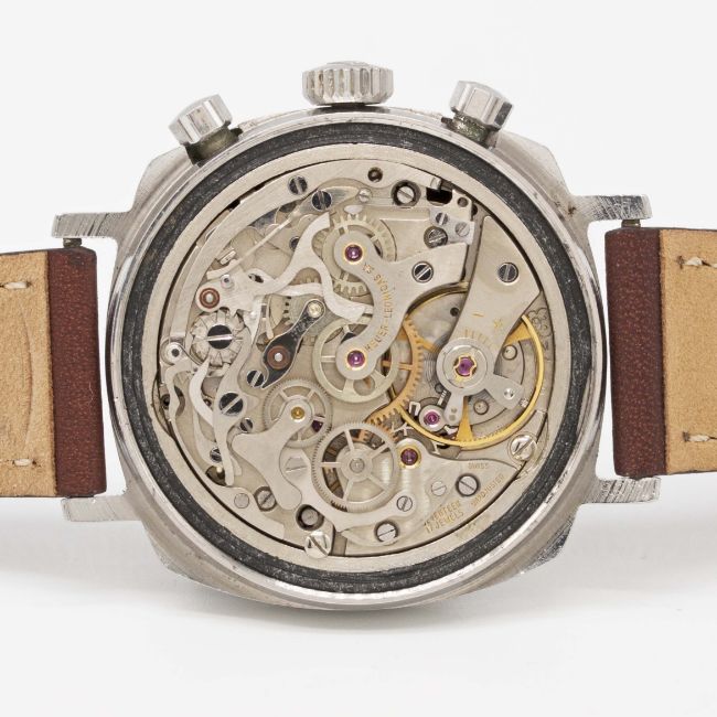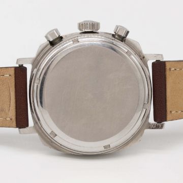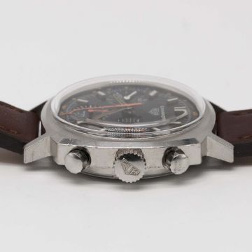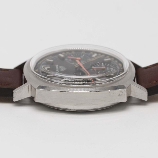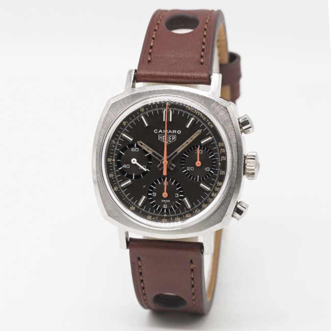 A RARE GENTLEMAN'S STAINLESS STEEL HEUER CAMARO CHRONOGRAPH WRIST WATCHCIRCA 1970, REF. 7220NT BROWN "CHOCOLATE" DIAL WITH LUMINOUS TACHYMETER SCALE & ORANGE CHRONOGRAPH HANDSMovement: 17J, manual wind, Valjoux cal. 72, signed Heuer-Leonidas SA.Case: Width approx. 37mm, screw back, signed Heuer-Leonidas S.A., numbered 19x,xxx, Heuer crown & pushers. Strap: Perforated leather.CONDITION REPORTDial: Original dial in excellent condition.Movement: Working at present.Case: In excellent condition, with some scratches due to general use.Strap/Bracelet: In excellent condition.