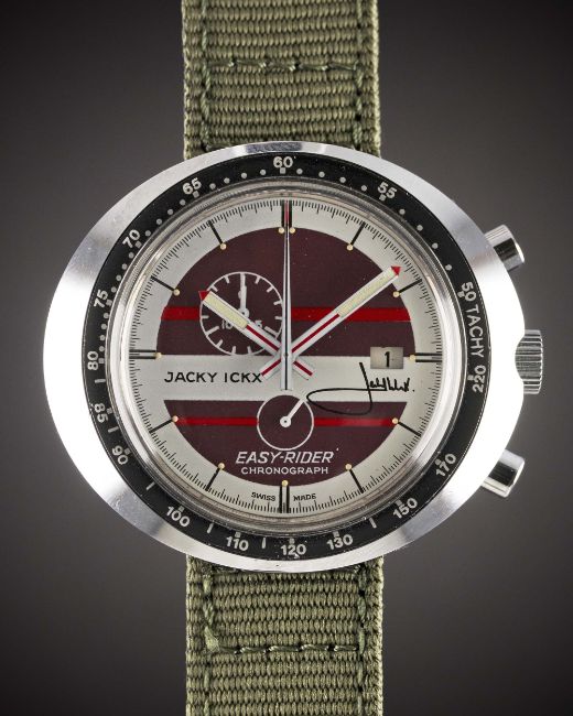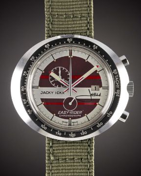 A GENTLEMAN'S HEUER JACKY ICKX EASY RIDER CHRONOGRAPH WRIST WATCHCIRCA 1970s, WITH MAROON DIALMovement: Manual wind.Case: Width approx. 45mm, chrome plated one piece case, tachy bezel.Strap: Textile.CONDITION REPORTDial: Original dial in excellent condition.Movement: Working at present.Case: In excellent condition.Strap/Bracelet: In excellent condition.