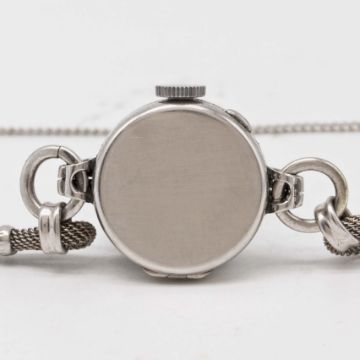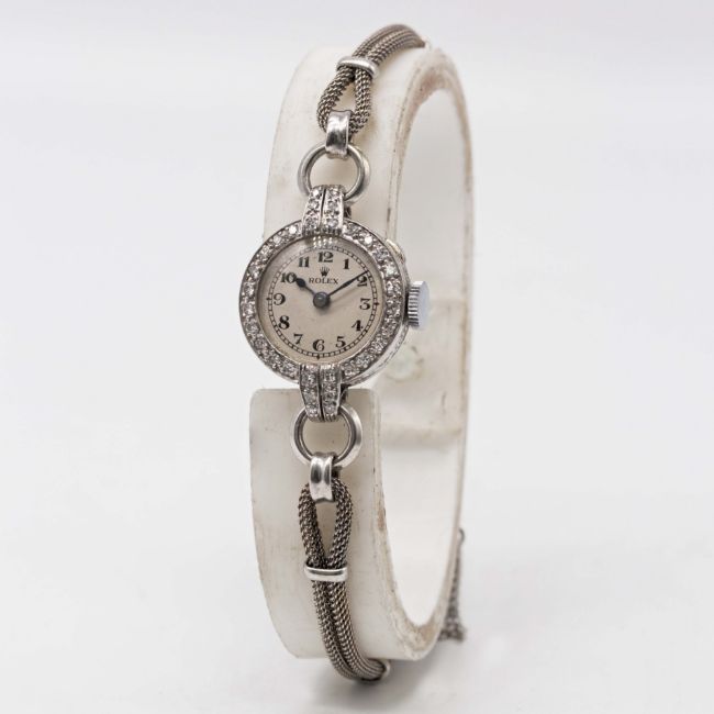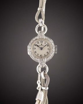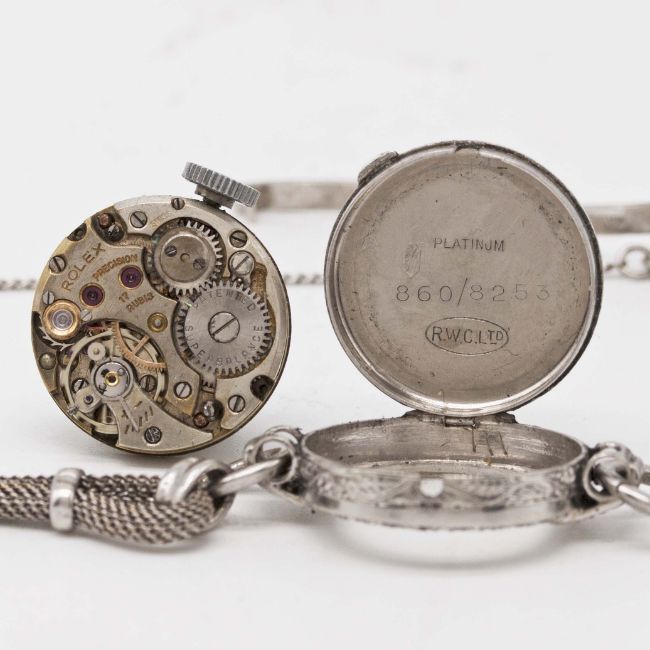 Case: Diameter approx. 19mm, hinged case, diamond set bezel & lugs, signed R.W.C. Ltd, numbered 86x/82xx, marked Platinum.