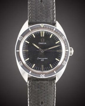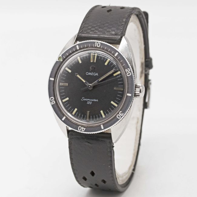 Case: Diameter approx. 37mm, screw back, Seamaster emblem on case back, signed Omega Watch Co, 60 minute rotating bezel faded to grey, Omega crown.