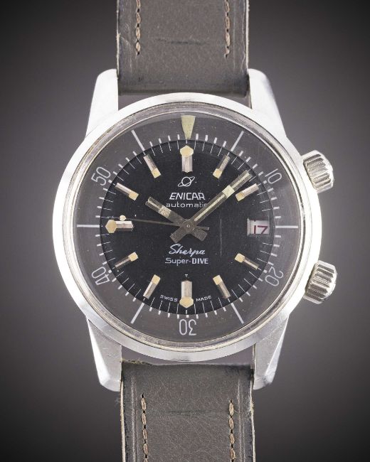 A GENTLEMAN'S STAINLESS STEEL ENICAR SHERPA SUPER DIVE WRIST WATCHCIRCA 1960s, REF. 144-35-02 WITH BLACK DIALMovement: Automatic, signed Enicar. Case: Diameter approx. 40mm, super compressor, Sherpa 600 emblem embossed on case back, possible Polish Military markings hand-inscribed on case back MW 66 237, signed Enicar Watch Co, numbered, Enicar anti-slip crowns.Strap: Leather.CONDITION REPORTDial: Original dial in excellent condition, inner rotating bezel showing some small signs of age.Movement: Working at present.Case: In very good condition, with some small scratches due to use.Strap/Bracelet: In fair condition.The timekeeping and accuracy of this watch has not been tested, therefore cannot be guaranteed.
