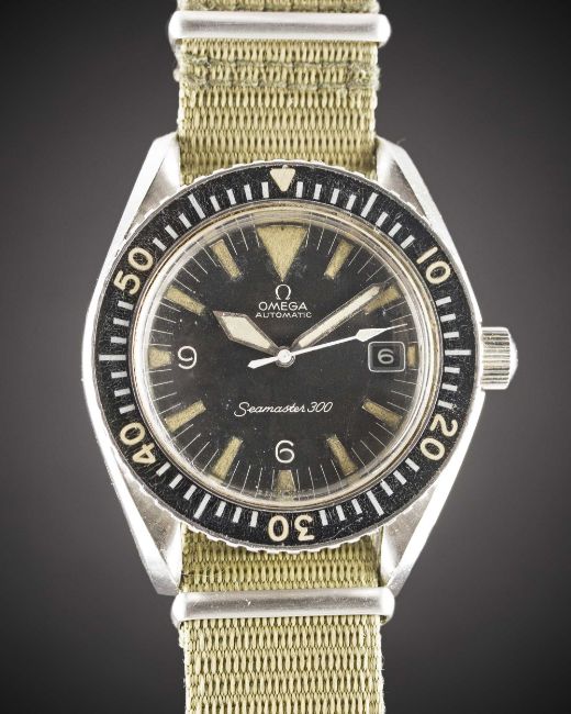 A GENTLEMAN'S STAINLESS STEEL OMEGA SEAMASTER 300 "BIG TRIANGLE" AUTOMATIC DATE WRIST WATCHCIRCA 1969, REF. 166.024 SP2 WITH "SWORD" HANDS Movement: 24J, automatic, cal. 565, signed Omega Watch Co, numbered 27,xxx,xxx. Case: Diameter approx. 42mm, screw back, signed Omega Watch Co, Seamaster emblem on case back, name inscribed on case back, 60 minute rotating bakelite bezel, Omega screw-down crown.Strap: NATO.CONDITION REPORTDial: Original dial in very good condition, showing some signs of age particular around the luminous.Movement: Running at present.Case: In good condition, with small scratches due to general use.Strap/Bracelet: In very good condition.The timekeeping and accuracy of this watch has not been tested, therefore cannot be guaranteed.