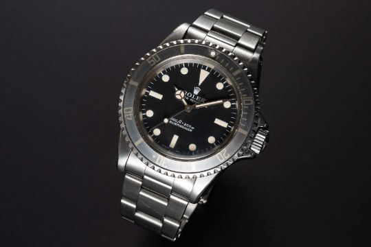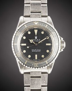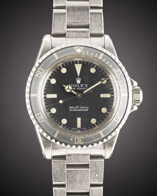 A GENTLEMAN'S STAINLESS STEEL ROLEX OYSTER PERPETUAL SUBMARINER BRACELET WATCHCIRCA 1974, REF. 5513 WITH FEET FIRST NON-SERIF DIAL & "GHOST" BEZEL, ACCOMPANIED BY ROLEX SERVICE GUARANTEE FROM 2005Movement: 26J, automatic, cal. 1520, signed Rolex Geneva.Case: Diameter approx. 40mm, Oyster case, signed Montres Rolex S.A., dated IV.71, numbered 3,7xx,xxx, faded fat font 60 minute rotating "ghost" bezel, Rolex triplock crown.Bracelet: Rolex Oyster Submariner bracelet with flip-lock clasp & extension, numbered S AD3/93150/580.CONDITION REPORTDial: Original dial in excellent condition.Movement: Running at present.Case: In excellent condition, with some small scratches due to general use.Strap/Bracelet: In very good condition, with some light scratches due to general use.The timekeeping and accuracy of this watch has not been tested, therefore cannot be guaranteed.