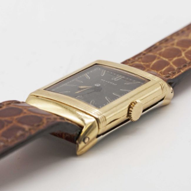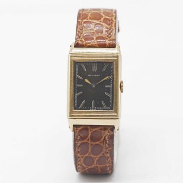 A RARE GENTLEMAN'S 18K SOLID YELLOW & WHITE GOLD REVERSO WRIST WATCHCIRCA 1930s, PRE JAEGER-LECOULTRE, WITH BLACK DIALMovement: 15J, manual wind, signed Lisica S.A., numbered 23x,xxx.Case: Approx. 38mm by 23mm, clean reverse side, 18k hallmarks, Owl import mark, Brevete S.G.D.G. patent marks, marked J.S. Megan, numbered 2,8xx. Strap: Leather strap with 18k gold pin buckle, with French eagle's head hallmark.CONDITION REPORTDial: Original dial in very good condition, showing small signs of age.Movement: Running at present.Case: In very good condition, with light scratches due to general use.Strap/Bracelet: In very good condition.The timekeeping and accuracy of this watch has not been tested, therefore cannot be guaranteed.