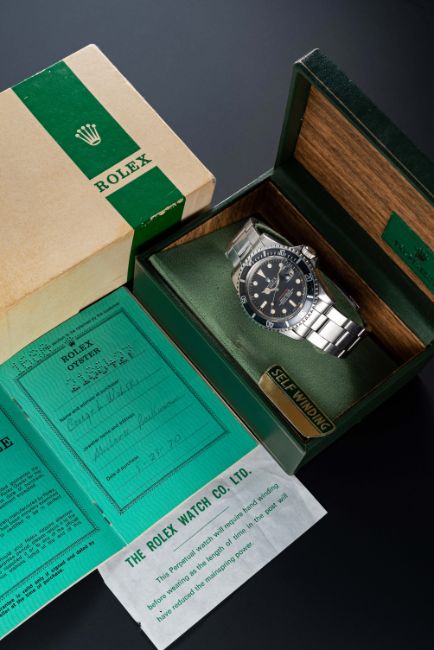 A VERY RARE GENTLEMAN'S STAINLESS STEEL ROLEX OYSTER PERPETUAL DATE "RED WRITING" SUBMARINER BRACELET WATCHDATED 1970, REF. 1680 WITH MK1 "METERS FIRST" DIAL, ACCOMPANIED BY THE ORIGINAL BOX & GUARANTEE BOOKLET (HOLE-PUNCHED)Movement: 26J, automatic chronometer, cal. 1570, signed Montres Rolex S.A., numbered.Case: Diameter approx. 40mm, Oyster case, signed Montres Rolex S.A., dated II.69, numbered 2,1xx,xxx, fat font 60 minute rotating bezel faded to dark grey, Rolex crown.Bracelet: Original Rolex Oyster Submariner bracelet with flip-lock clasp & "Patent Pending" diving extension, numbered 9315/285, dated 2.70.CONDITION REPORTDial: Original dial in excellent condition, showing some very small signs of age, luminous showing a nice patina.Movement: Running at present.Case: In very good condition, with small scratches due to general use.Strap/Bracelet: In good condition, with light scratches due to general use.The timekeeping and accuracy of this watch has not been tested, therefore cannot be guaranteed.