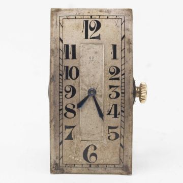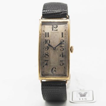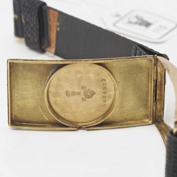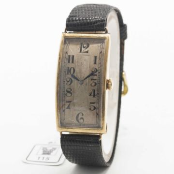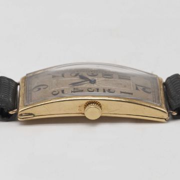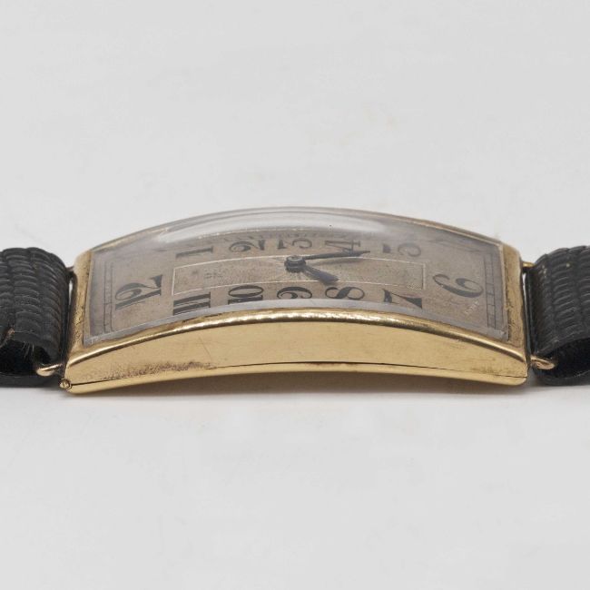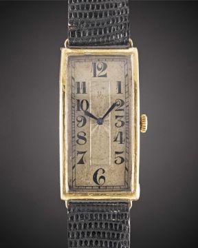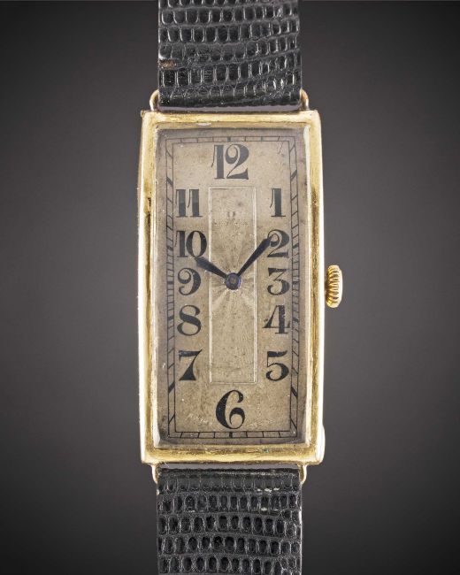 A RARE GENTLEMAN'S LARGE SIZE 18K SOLID GOLD OMEGA ART DECO "CURVEX" WRIST WATCHCIRCA 1920sMovement: Manual wind, signed Omega, numbered 7,0xx,xxx. Case: Approx. 45mm by 23mm, hinged case, signed Omega, marked JL, 18k hallmarks with date letter (i), numbered 6,6xx,xxx.Strap: Leather.CONDITION REPORTDial: Original dial in fair condition, showing signs of age.Movement: Running at present.Case: In fair condition, with light scratches & wear due to general use.Strap/Bracelet: In excellent condition.The timekeeping and accuracy of this watch has not been tested, therefore cannot be guaranteed.