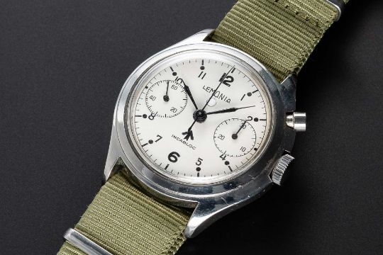A RARE GENTLEMAN'S STAINLESS STEEL BRITISH MILITARY ROYAL NAVY NUCLEAR SUBMARINE LEMANIA SINGLE BUTTON CHRONOGRAPH WRIST WATCHCIRCA 1960s  Movement: 17, manual wind, cal. 2220, signed Lemania Watch Co, numbered 1,5xx,xxx.Case: Diameter approx. 40mm, asymmetric, screw back, numbered, issue markings ^ 0552/924-3312 81234 (3306 crossed out).Strap: NATO.These watches were issued to personnel onboard nuclear submarines. The dials & hands did not contain any luminous material which therefore could not interfere with radiation detectors onboard (giving false positive readings).CONDITION REPORTDial: Original dial in very good condition, showing some signs of age.Movement: Running at present.Case: In very good condition, with some small scratches due to use.Strap/Bracelet: In excellent condition.The timekeeping and accuracy of this watch has not been tested, therefore cannot be guaranteed.