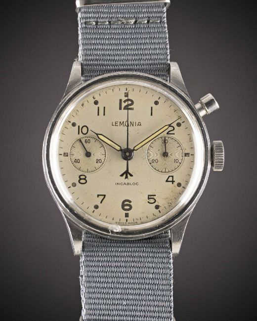 A RARE GENTLEMAN'S STAINLESS STEEL ROYAL RHODESIAN AIR FORCE MILITARY LEMANIA SINGLE BUTTON PILOTS CHRONOGRAPH WRIST WATCHCIRCA 1960s, SECOND SERIES WITH SILVER DIAL, ACCOMPANIED BY ROYAL RHODESIAN AIR FORCE "RETURNED EQUIPMENT" CARD FOR REPAIR DATED 1980Movement: 17J, manual wind, cal. 2220, signed Lemania Watch Co, numbered 1,0xx,xxx.Case: Diameter approx. 38mm, fixed bars, screw back, maker's mark HF, issue markings 6B/551 962054.Strap: NATO.CONDITION REPORTDial: Original dial in good condition, showing signs of age.Movement: Running at present.Case: In fair condition, with scratches & some wear due to use.Strap/Bracelet: In excellent condition.The timekeeping and accuracy of this watch has not been tested, therefore cannot be guaranteed.