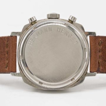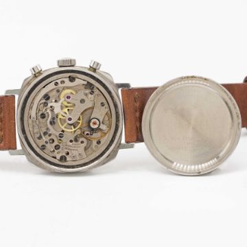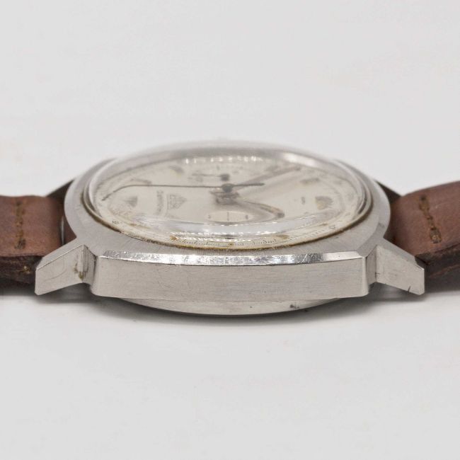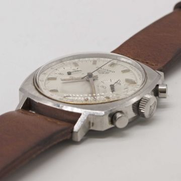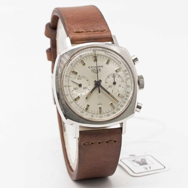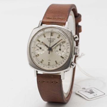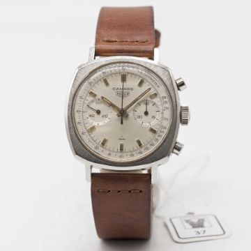 A GENTLEMAN'S STAINLESS STEEL HEUER CAMARO CHRONOGRAPH WRIST WATCHCIRCA 1970, REF. 9220T WITH SILVER TACHYMETRE DIALMovement: 17J, manual wind, Valjoux cal. 92, signed Heuer Leonidas SA.Case: Width approx. 37mm, screw back, signed Heuer-Leonidas S.A., numbered 98,xxx, name 'Hermann Herget' inscribed on case back, Heuer crown.Strap: Leather.CONDITION REPORTDial: Original dial in excellent condition.Movement: Working at present.Case: In excellent condition, with some scratches due to general use.Strap/Bracelet: In excellent condition.