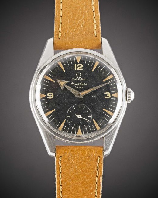A RARE GENTLEMAN'S STAINLESS STEEL OMEGA RANCHERO WRIST WATCHCIRCA 1958, REF. 2990 1 WITH BLACK DIAL & "BROAD ARROW" HANDSMovement: 17J, manual wind, cal. 267, signed Omega, numbered 16,xxx,xxx. Case: Diameter approx. 36mm, "waterproof" snap back, signed Omega Watch Co, Omega crown.Strap: Leather.CONDITION REPORTDial: Original dial in very good condition, showing small signs of age.Movement: Running at present.Case: In excellent condition, with some small scratches due to general use.Strap/Bracelet: In excellent condition.The timekeeping and accuracy of this watch has not been tested, therefore cannot be guaranteed.