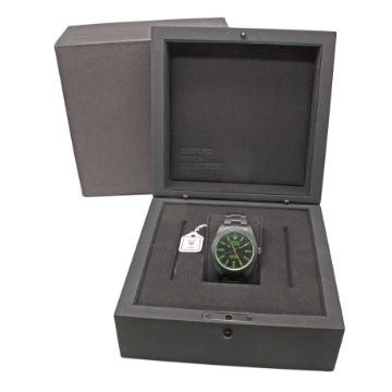 A GENTLEMAN'S MATT BLACK COATED STAINLESS STEEL BAMFORD ROLEX OYSTER PERPETUAL "GREEN GLASS" MILGAUSS BRACELET WATCHCIRCA 2017, REF. 116400 GV LIMITED EDITION OF 100 PIECES, WITH HONEYCOMB DIAL, ACCOMPANIED BY ORIGINAL BAMFORD WATCH DEPARTMENT BOXMovement: Automatic chronometer, signed Rolex, numbered.Case: Diameter approx. 40mm, Oyster case, signed Bamford Watch Dept on case back with limited edition number, signed Rolex, numbered, green sapphire crystal, Rolex crown.Bracelet: Black coated Rolex Oyster bracelet, marked A4X.CONDITION REPORTDial: Original dial in excellent condition.Movement: Running at present.Case: In excellent condition.Strap/Bracelet: In excellent condition.The timekeeping and accuracy of this watch has not been tested, therefore cannot be guaranteed.