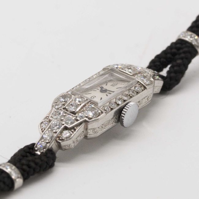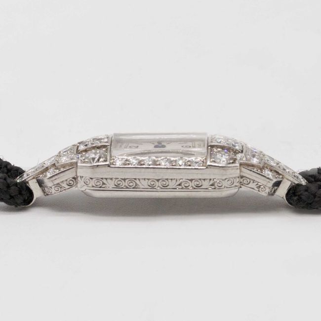 A FINE LADIES PLATINUM & DIAMOND PATEK PHILIPPE COCKTAIL WRIST WATCHCIRCA 1930sMovement: Manual wind, signed Patek Philippe & Co., numbered 82x,xxx.Case: Width approx. 10.5mm, hinged case, period engraved sides, original diamond set, signed Patek Philippe & Co, numbered 61x,xxx, marked Platine.Strap: Textile strap with diamond-set loops & Platinum buckle, marked PT.950, signed Unroc.CONDITION REPORTDial: Dial in very good condition.Movement: Running at present.Case: In very good condition, with some small scratches due to general use.Strap/Bracelet: In excellent condition.The timekeeping and accuracy of this watch has not been tested, therefore cannot be guaranteed.