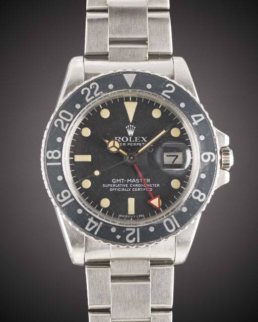 A RARE GENTLEMAN'S STAINLESS STEEL ROLEX OYSTER PERPETUAL GMT MASTER BRACELET WATCHCIRCA 1973, REF. 1675 WITH LATER MK4 DIAL & "ALL RED" GMT HAND Movement: 26J, automatic chronometer, cal. 1570, signed Montres Rolex S.A., numbered.Case: Diameter approx. 40mm, Oyster case, signed Montres Rolex S.A., dated III.72, numbered 3,2xx,xxx, 24 hour rotating "all black" bezel faded to grey, Rolex crown.Bracelet: Rolex Oyster bracelet, numbered AB5/78360/558B.CONDITION REPORTDial: Later period original dial in excellent condition, luminous showing a nice patina.Movement: Running at present.Case: In very good condition, with small scratches due to general use.Strap/Bracelet: In excellent condition, with some light scratches due to general use.The timekeeping and accuracy of this watch has not been tested, therefore cannot be guaranteed.