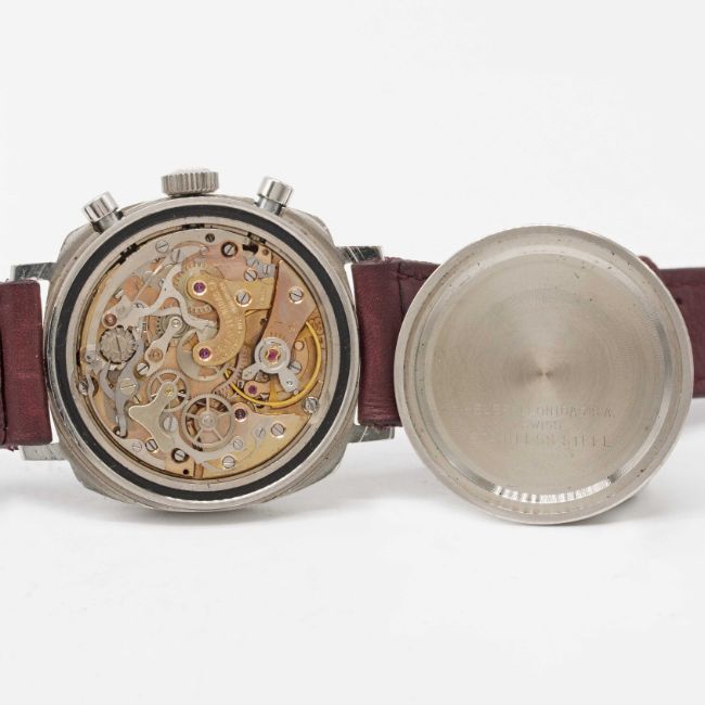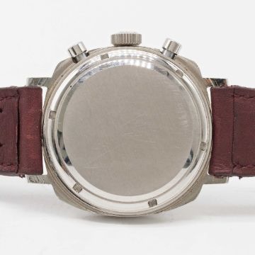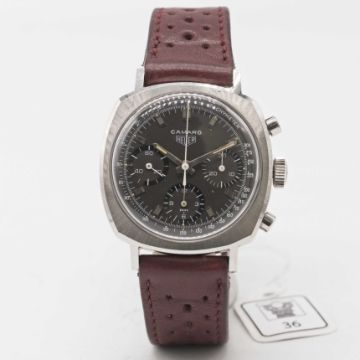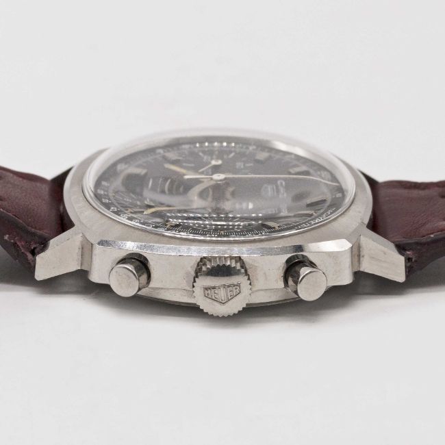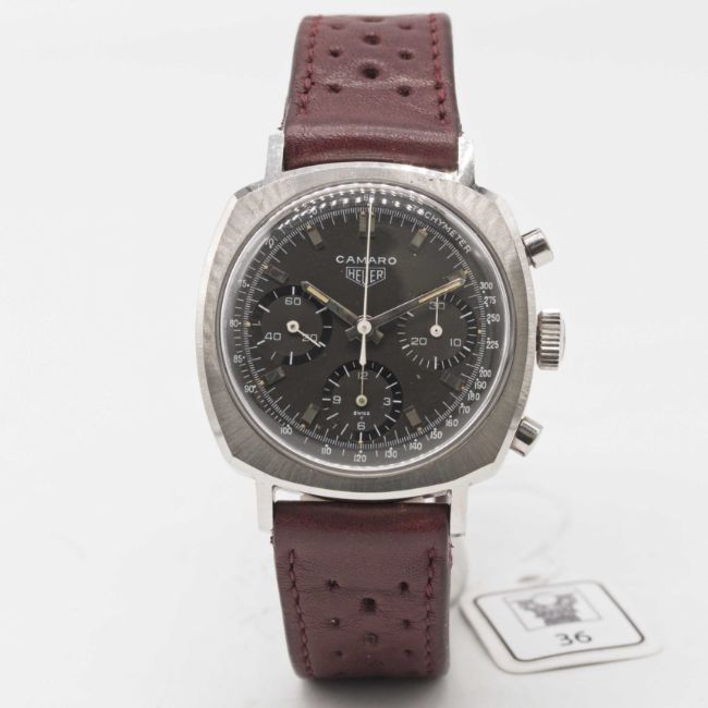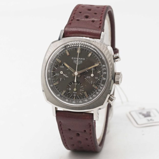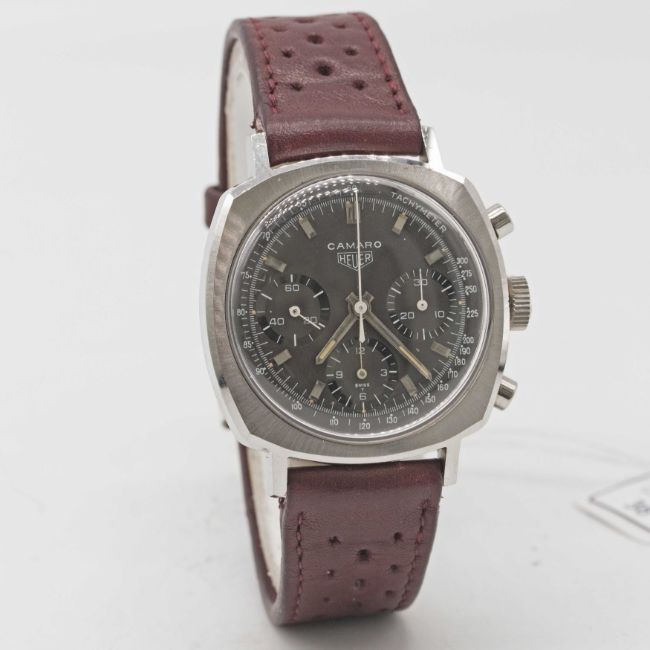 A GENTLEMAN'S STAINLESS STEEL HEUER CAMARO CHRONOGRAPH WRIST WATCHCIRCA 1960s, REF. 7220NT WITH BROWN "CHOCOLATE" TACHYMETER DIALMovement: 17J, manual wind, Valjoux cal. 72, signed Heuer-Leonidas SA.Case: Width approx. 37mm, screw back, signed Heuer-Leonidas S.A., numbered 97,xxx, Heuer crown. Strap: Perforated leather.CONDITION REPORTDial: Original dial in excellent condition.Movement: Running at present.Case: In excellent condition, with some small scratches due to general use.Strap/Bracelet: In very good condition.The timekeeping and accuracy of this watch has not been tested, therefore cannot be guaranteed.