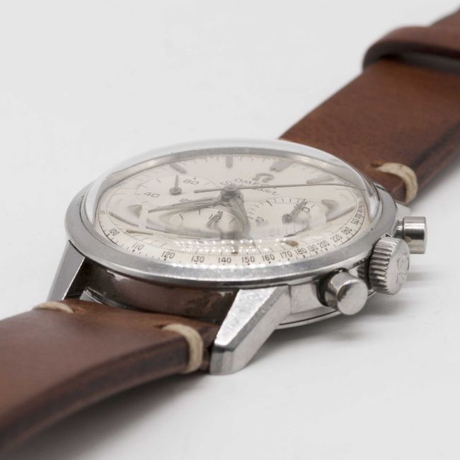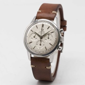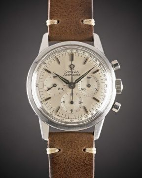 A GENTLEMAN'S STAINLESS STEEL OMEGA SEAMASTER CHRONOGRAPH WRIST WATCHCIRCA 1962, REF. 105.001-62 WITH SILVER TACHYMETRE DIAL & "ALPHA" HANDSMovement: 17J, manual wind, cal. 321, signed Omega Watch Co, numbered 19,xxx,xxx. Case: Diameter approx. 35.5mm, screw back, signed Omega Watch Co, Omega "flat feet" crown.Strap: Leather.CONDITION REPORTDial: Original dial in good condition, showing some signs of age.Movement: Running at present.Case: In very good condition, with small scratches due to general use.Strap/Bracelet: In excellent condition.The timekeeping and accuracy of this watch has not been tested, therefore cannot be guaranteed.