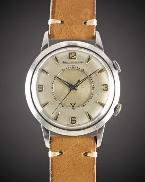 A RARE GENTLEMAN'S STAINLESS STEEL JAEGER LECOULTRE MEMOVOX AUTOMATIC ALARM WRIST WATCHCIRCA 1960, WITH QUARTERLY ARABIC NUMERAL DIAL & DAUPHINE HANDSMovement: "Bumper" automatic, cal. P815, signed Jaeger-LeCoultre, numbered 1,2xx,xxx.Case: Diameter approx. 37mm, two-part case back, signed LeCoultre Co, numbered 72x,xxx.Strap: Leather.CONDITION REPORTDial: Original dial in very good condition, showing some signs of age.Movement: Running at present.Case: In excellent condition, with scratches due to general use.Strap/Bracelet: In excellent condition.The timekeeping and accuracy of this watch has not been tested, therefore cannot be guaranteed.