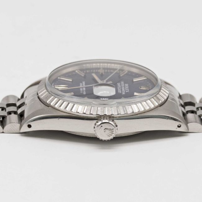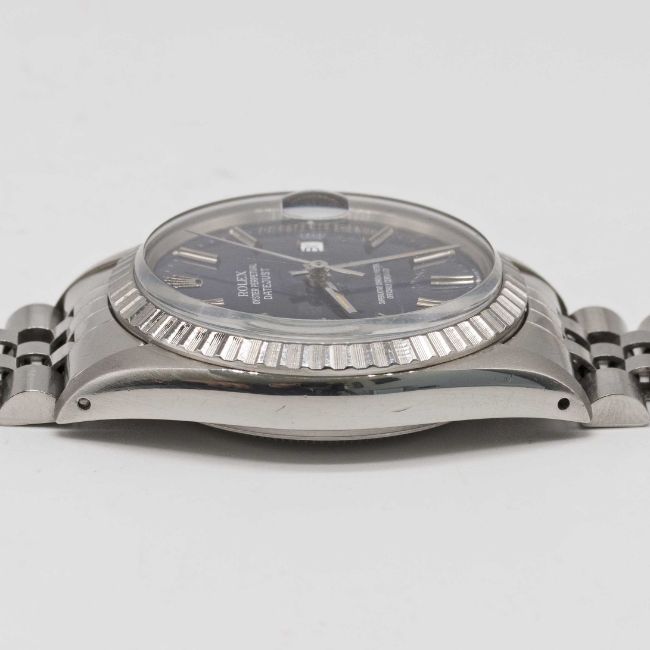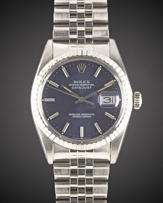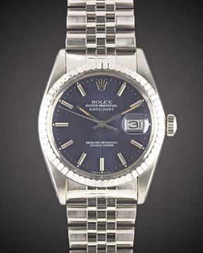 A GENTLEMAN'S STAINLESS STEEL ROLEX OYSTER PERPETUAL DATEJUST BRACELET WATCHCIRCA 1981, REF. 16030 WITH PURPLE-BLUE DIALMovement: 27J, automatic chronometer, quick-set date, cal. 3035, signed Rolex S.A., numbered.Case: Diameter approx. 36mm, Oyster case, signed Montres Rolex S.A., numbered 7,0xx,xxx, milled bezel, Rolex crown.Bracelet: Original Rolex Jubilee bracelet, numbered D/62510H/555.CONDITION REPORTDial: Original dial in excellent condition.Movement: Working at present.Case: In excellent condition, with some small scratches due to general use.Strap/Bracelet: In excellent condition, with some light scratches due to general use.