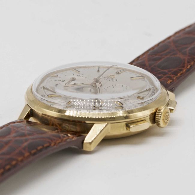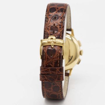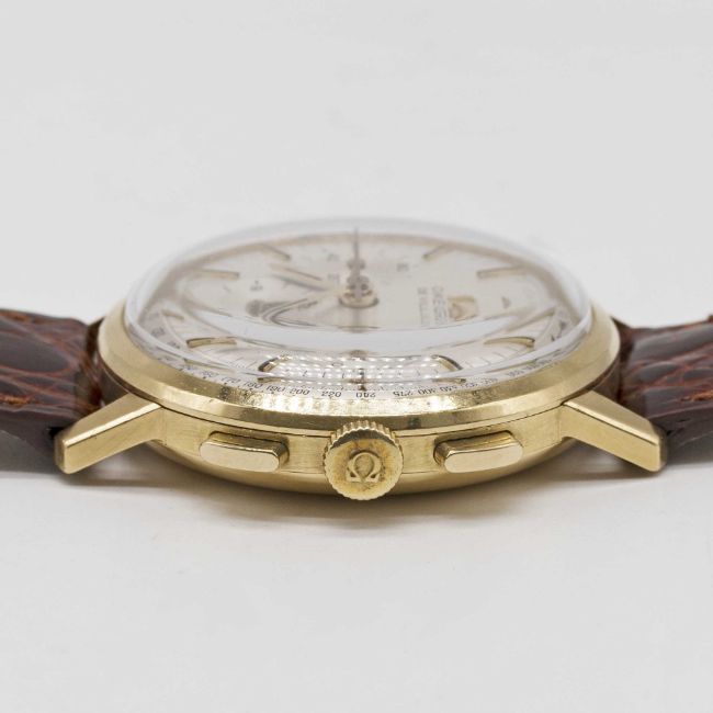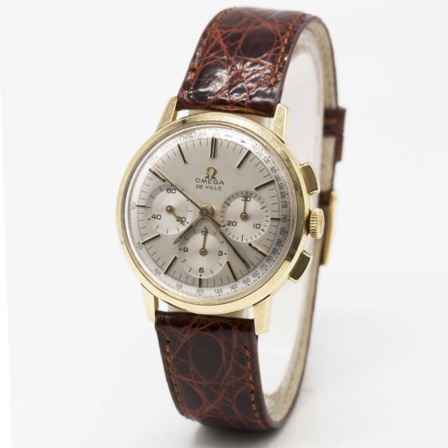A GENTLEMAN'S 18K SOLID GOLD OMEGA DE VILLE CHRONOGRAPH WRIST WATCHCIRCA 1968, REF. 141.010-67 WITH BRUSHED SILVER TACHYMETRE DIALMovement: 17J, manual wind, cal. 321, signed Omega Watch Co, numbered 26,xxx,xxx.Case: Diameter approx. 35mm, snap back, signed Omega Watch Co, 18k hallmarks, owl import marks & MBF mark to outside case back, Omega crown.Strap: Leather.CONDITION REPORTDial: Original dial in excellent condition, showing some small signs of age.Movement: Running at present.Case: In excellent condition, with some light scratches due to general use.Strap/Bracelet: In excellent condition.The timekeeping and accuracy of this watch has not been tested, therefore cannot be guaranteed.