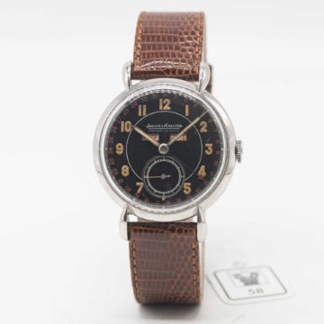 A RARE GENTLEMAN'S LARGE SIZE STAINLESS STEEL JAEGER LECOULTRE TRIPLE CALENDAR WRIST WATCHCIRCA 1940s, BLACK "FABRIQUE EN SUISSE" DIAL WITH LUMINOUS ARABIC NUMERALS & HANDSMovement: Manual wind, cal. P484/A, signed Jaeger-LeCoultre, numbered 44x,xxx.Case: Diameter approx. 36mm, numbered 42x,xxx, "teardrop" lugs.Strap: Leather.CONDITION REPORTDial: Original dial in very good condition, showing some signs of age.Movement: Running at present.Case: In very good condition, with some small scratches due to general use.Strap/Bracelet: In excellent condition.The timekeeping and accuracy of this watch has not been tested, therefore cannot be guaranteed.
