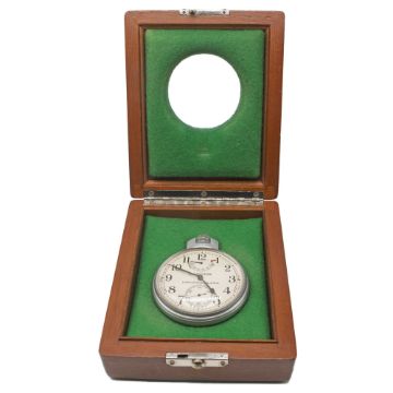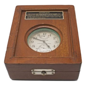 A HAMILTON LANCASTER PA U.S.A. "MODEL 22" DECK CHRONOMETER WATCH CIRCA 1943, WITH 48 HOUR UP & DOWN INDICATOR, IN ORIGINAL FITTED WOODEN BOX (MARKED PAA) WITH PLAQUE Movement: Keyless manual wind, Model 22-21 Jewels, Made in U.S.A, signed Hamilton Watch Co., U.S. Navy-Bu.Ships-1943, numbered 2F2xxxx.Case: Diameter approx. 70.5mm, matt finish, screw back & front, signed Keystone, marked base metal, numbered 18,xxx to inside case back, numbered 26634 to outside case back & marked PAA, dust cover.     CONDITION REPORTDial: Original dial in very good condition, showing small signs of age. Movement: Running at present. Case: In very good condition, with some light scratches due to use. The timekeeping and accuracy of this watch has not been tested, therefore cannot be guaranteed.