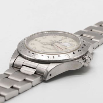 A VERY RARE GENTLEMAN'S STAINLESS STEEL ROLEX OYSTER PERPETUAL DATE EXPLORER II BRACELET WATCHCIRCA 1984, REF. 16550 WITH CREAM "NON-HYPHEN DOUBLE T" DIALMovement: 27J, automatic chronometer, quick-set date, cal. 3085, signed Rolex S.A., numbered.Case: Diameter approx. 40mm, Oyster case, signed Montres Rolex S.A., numbered 8,3xx,xxx, sapphire crystal, fixed 24 hour bezel, Rolex crown.Bracelet: Original Rolex Oyster bracelet, numbered J5/78360/501.CONDITION REPORTDial: Original dial in excellent condition, showing a "cream" patina.Movement: Running at present.Case: In very good condition, with small scratches due to general use.Strap/Bracelet: In excellent condition, with light scratches due to general use.The timekeeping and accuracy of this watch has not been tested, therefore cannot be guaranteed.