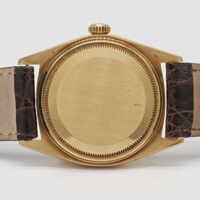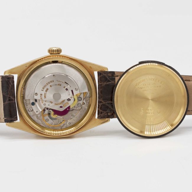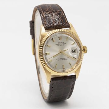 A GENTLEMAN'S 18K SOLID GOLD ROLEX OYSTER PERPETUAL DATEJUST WRIST WATCHCIRCA 1967, REF. 1601 WITH SILVER DIALMovement: 26J, automatic chronometer, cal. 1570, signed Montres Rolex S.A., numbered.Case: Diameter approx. 36mm, Oyster case, signed Montres Rolex S.A., numbered 1,6xx,xxx, 18k hallmarks, fluted bezel, Rolex crown.Strap: Rolex leather strap & gold-plated pin buckle.CONDITION REPORTDial: Original dial in excellent condition.Movement: Running at present.Case: In excellent condition, with some light scratches due to general use.Strap/Bracelet: In excellent condition.The timekeeping and accuracy of this watch has not been tested, therefore cannot be guaranteed.