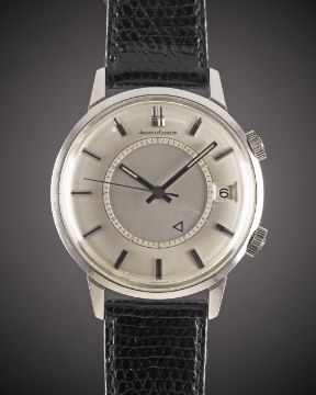 A GENTLEMAN'S LARGE SIZE STAINLESS STEEL JAEGER LECOULTRE MEMOVOX ALARM WRIST WATCHCIRCA 1960sMovement: Manual wind, signed, numbered.Case: Diameter approx. 37mm, "monocoque" case, signed, numbered, JLC crowns.Strap: Leather.CONDITION REPORTDial: Original dial in excellent condition.Movement: Working at present.Case: In excellent condition.Strap/Bracelet: In good condition.