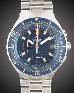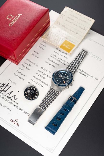 A RARE GENTLEMAN'S STAINLESS STEEL OMEGA SEAMASTER "BIG BLUE" AUTOMATIC CHRONOGRAPH BRACELET WATCHDATED 1976, REF. ST 176.004 WITH PORTUGUESE IMPORT MARK, ACCOMPANIED BY OMEGA EXTRACT OF THE ARCHIVES SHOWING DELIVERY TO PORTUGAL IN 1974, THE ORIGINAL BOX, GUARANTEE (SOLD IN PORTUGAL IN 1976), ORIGINAL REPLACEMENT "TROPICAL" DIAL, HANDS, CROWN & PUSHERS & BLUE TROPIC SPORT STRAP WITH OMEGA PIN BUCKLEMovement: 22J, automatic, cal. 1040, signed Omega, numbered 35,xxx,xxx.Case: Diameter approx. 43mm, screw back, Seamaster emblem engraved on case back, signed Omega Watch Co., Portuguese import mark between crown & top pusher, 60 minute rotating acrylic bezel, Omega screw-down crown.Bracelet: Original Omega bracelet, numbered (11) 1162/172.CONDITION REPORTDial: Service dial in excellent condition, spare original dial in fair "tropical" condition, showing signs of age.Movement: Running at present.Case: In very good condition, with some light scratches due to general use, acrylic bezel free of cracks.Strap/Bracelet: In very good condition, with some light scratches due to general use.The timekeeping and accuracy of this watch has not been tested, therefore cannot be guaranteed.