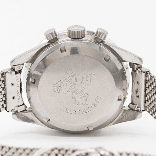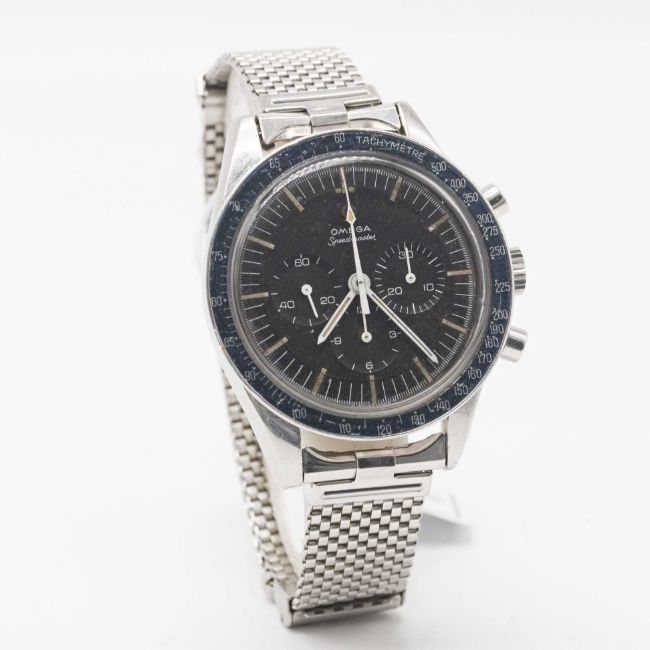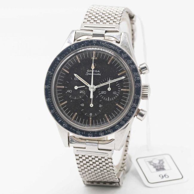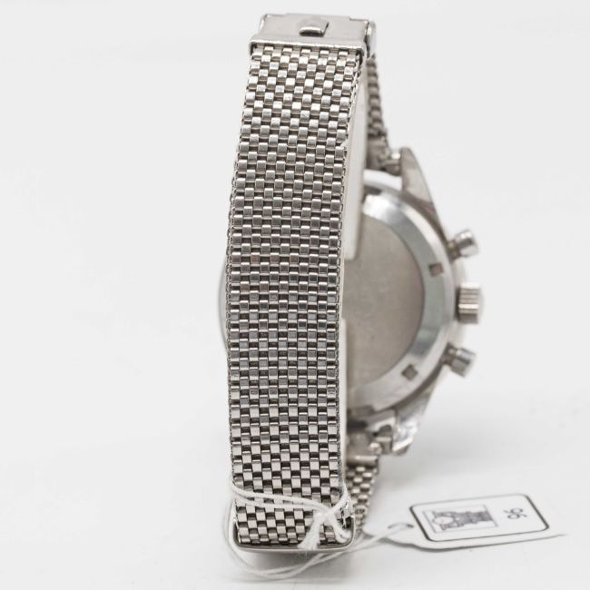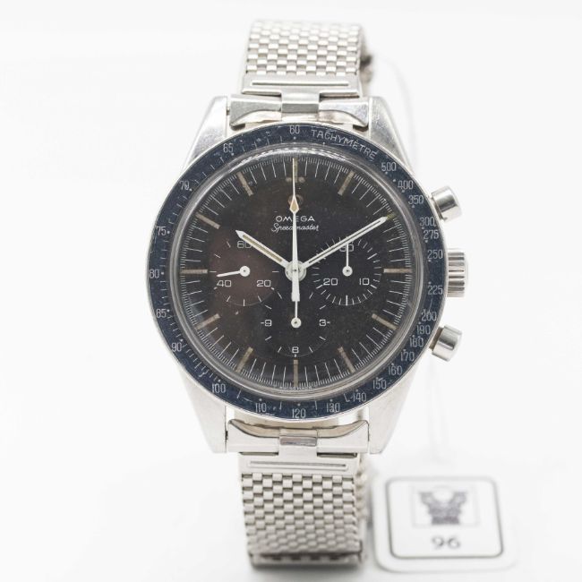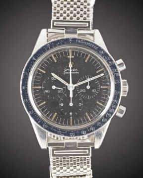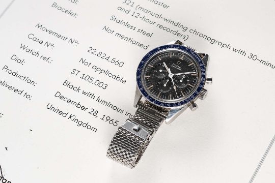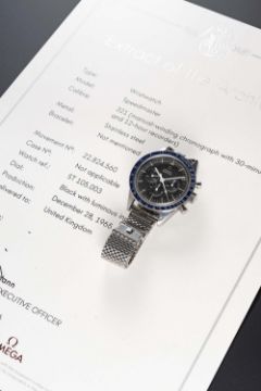 A VERY RARE GENTLEMAN'S STAINLESS STEEL OMEGA SPEEDMASTER "ED WHITE" CHRONOGRAPH BRACELET WATCHDATED 1965, REF. S 105.003-64 WITH ORIGINAL BLUE "DON" BEZEL, ACCOMPANIED BY OMEGA EXTRACT OF THE ARCHIVES SHOWING DELIVERY TO UNITED KINGDOM Movement: 17J, manual wind, cal. 321, signed Omega Watch Co., numbered 22,xxx,xxx. Case: Diameter approx. 40mm, screw back, signed Omega Watch Co, Speedmaster emblem engraved on case back, blue "DON" tachymetre bezel, dust cover, Omega crown.Bracelet: JB Champion "Speedmaster" bracelet, USA Patent no. 3.030.686.CONDITION REPORTDial: Original dial in good condition, showing small signs of age & a dark brown patina.Movement: Running at present.Case: In very good condition, with some small scratches due to general use.Strap/Bracelet: In very good condition.The timekeeping and accuracy of this watch has not been tested, therefore cannot be guaranteed.