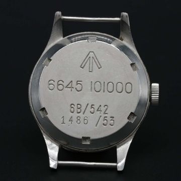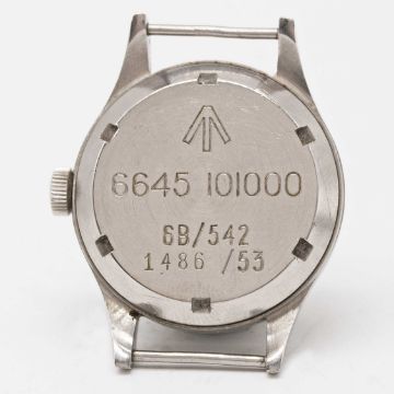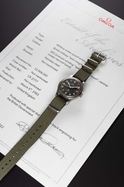 A RARE GENTLEMAN'S STAINLESS STEEL BRITISH MILITARY OMEGA RAF PILOTS WRIST WATCHDATED 1953, REF. 2777-1 SC WITH ORIGINAL "THIN ARROW" DIAL, ACCOMPANIED BY OMEGA EXTRACT OF THE ARCHIVES SHOWING DELIVERY TO THE UNITED KINGDOM & WITH THE REMARKS "PRODUCED WITH SPECIAL DIAL AND CASE-BACK ENGRAVING FOR THE BRITISH GOVERNMENT" Movement: 17J, manual wind, cal. 283, signed Omega, numbered 12,xxx,xxx.Case: Diameter approx. 37mm, fixed bars, screw back, signed Omega Watch Co, issue markings ^ 6645 101000 6B/542 1486/53, dust cover.Strap: NATO.CONDITION REPORTDial: Original dial in good condition, showing signs of age.Movement: Running at present.Case: In very good condition, with small scratches due to use.Strap/Bracelet: In excellent condition.The timekeeping and accuracy of this watch has not been tested, therefore cannot be guaranteed.