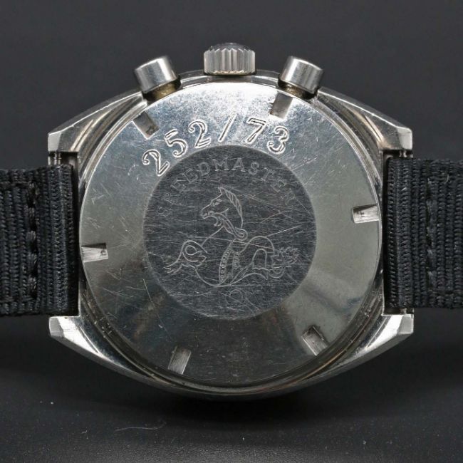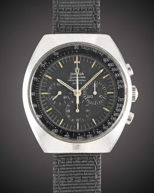 A RARE GENTLEMAN'S STAINLESS STEEL ROYAL RHODESIAN AIR FORCE MILITARY OMEGA SPEEDMASTER PROFESSIONAL MARK II CHRONOGRAPH WRIST WATCHCIRCA 1973, REF. 145.014 ACCOMPANIED BY ROYAL RHODESIAN AIR FORCE "RETURNED EQUIPMENT" CARD FOR REPAIR DATED 1980Movement: 17J, manual wind, cal. 861, signed Omega, numbered 31,xxx,xxx.Case: Width approx. 42mm, screw back, Speedmaster emblem embossed on case back, signed Omega Watch Co, issue markings 252/73, Omega crown.Strap: Textile.CONDITION REPORTDial: Original dial in excellent condition, showing some small signs of age.Movement: Running at present.Case: In fair condition, with scratches & wear due to use, crystal heavily scratched.Strap/Bracelet: In excellent condition.The timekeeping and accuracy of this watch has not been tested, therefore cannot be guaranteed.