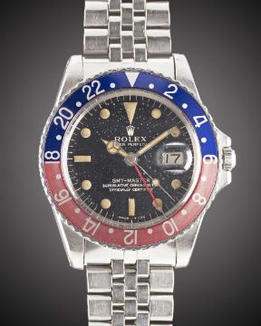 A RARE GENTLEMAN'S STAINLESS STEEL ROLEX OYSTER PERPETUAL GMT MASTER BRACELET WATCHCIRCA 1966, REF. 1675 WITH GLOSS BLACK GILT DIAL & SMALL ARROW GMT HANDMovement: 26J, automatic chronometer, cal. 1570, signed Montres Rolex S.A., numbered.Case: Diameter approx. 40mm, Oyster case, signed Montres Rolex S.A., dated IV.65, numbered 1,3xx,xxx, 24 hour rotating "Pepsi" bezel, Rolex crown.Bracelet: Rolex Jubilee bracelet, numbered 6251H/55, dated 8.72.CONDITION REPORTDial: Original dial in good condition, showing signs of age.Movement: Running at present.Case: In good condition, with small scratches due to general use, some dents to outer edge of case back. Strap/Bracelet: In good condition, with some wear due to general use.The timekeeping and accuracy of this watch has not been tested, therefore cannot be guaranteed.