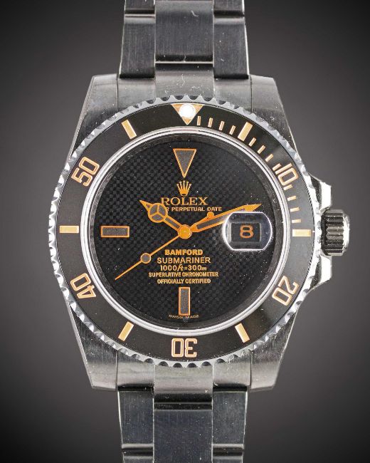 A GENTLEMAN'S BLACK COATED STAINLESS STEEL BAMFORD ROLEX OYSTER PERPETUAL SUBMARINER BRACELET WATCHCIRCA 2017, REF. 116610 WITH ORIGINAL BAMFORD WATCH DEPARTMENT BOXMovement: Automatic chronometer, signed Rolex, numbered.Case: Diameter approx. 40mm, Oyster case, signed Bamford Watch Dept on case back, signed Rolex, numbered, 60 minute rotating Cerachrom bezel, sapphire crystal, Rolex Triplock crown.Bracelet: Black coated Rolex Oyster Submariner bracelet with flip-lock clasp, marked D2S.CONDITION REPORTDial: Original dial in excellent condition.Movement: Running at present.Case: In excellent condition, with some light scratches due to occasional use.Strap/Bracelet: In excellent condition, with some light scratches due to occasional use.The timekeeping and accuracy of this watch has not been tested, therefore cannot be guaranteed.
