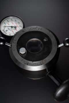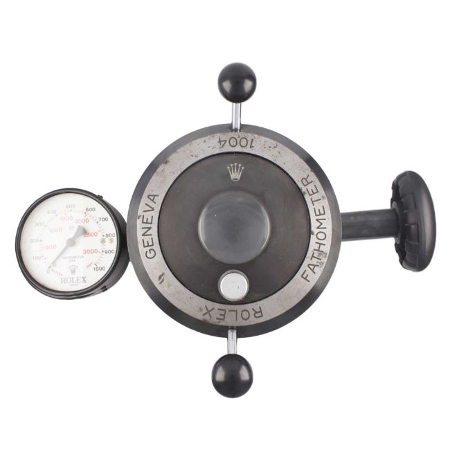A VERY RARE ROLEX FATHOMETER 1004 "DEEP SEA" OYSTER WATER RESISTANCE PRESSURE TESTING TOOLCIRCA 1960s, REF. 1004Very heavy metal case with inner pressure chamber, screw top facilitated by two levers, pressure gauge to left side with dial signed Fathometer 1004, arm to opposite side with screw clamp, base diameter approx. 15cm, total height (including levers) approx. 16cm.CONDITION REPORTDial: Original dial in good condition, showing small signs of age.Case: In good condition, with some scratches & signs of wear due to general use.The operation and accuracy of this lot has not been tested, therefore cannot be guaranteed.