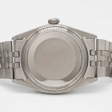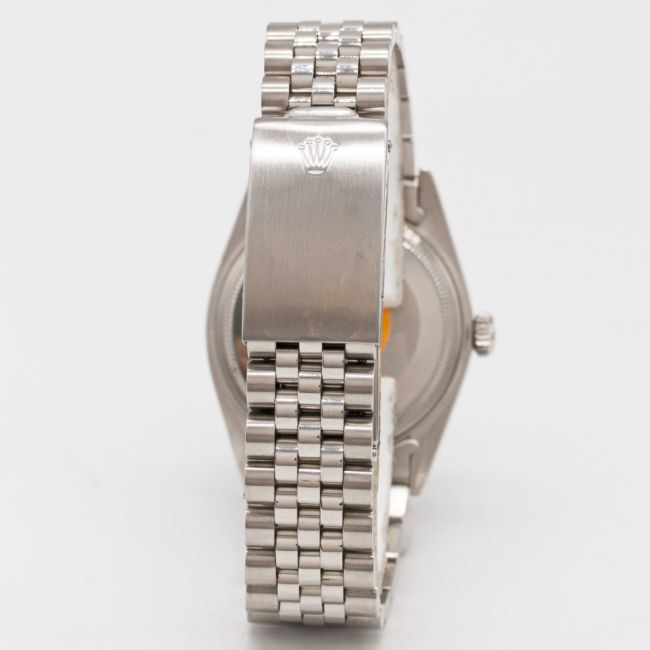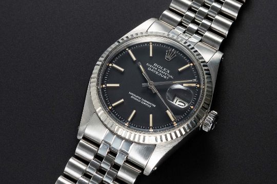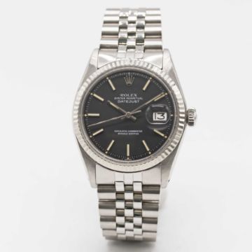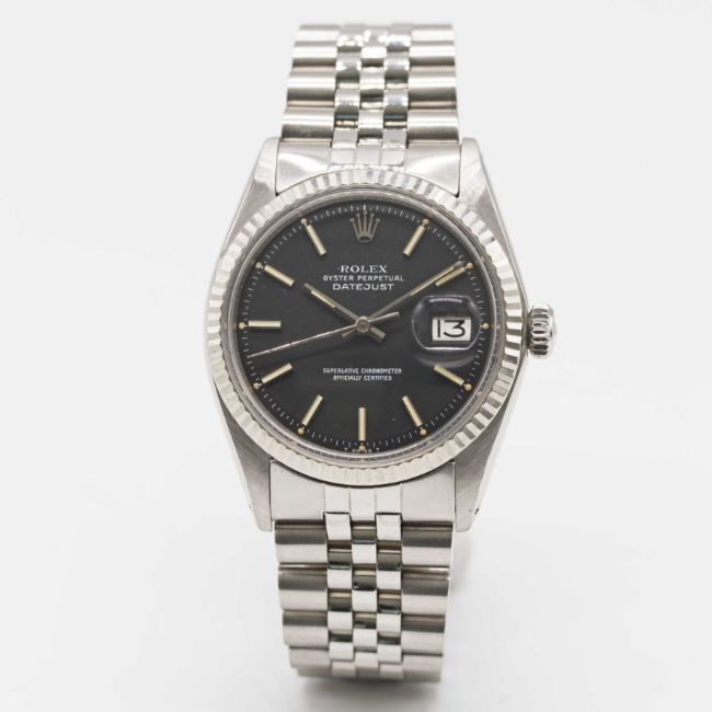 A GENTLEMAN'S STEEL & WHITE GOLD ROLEX OYSTER PERPETUAL DATEJUST BRACELET WATCHCIRCA 1976, REF. 1601 WITH RARE MATT BLACK DIALMovement: 26J, automatic chronometer, cal. 1570, signed Montres Rolex S.A., numbered.Case: Diameter approx. 36mm, Oyster case, signed Montres Rolex S.A., numbered 4,1xx,xxx, solid white gold fluted bezel, Rolex crown.Bracelet: Rolex Jubilee bracelet, numbered B9/62510H/555.CONDITION REPORTDial: Original dial in excellent condition.Movement: Running at present.Case: In excellent condition, with some light scratches due to general use.Strap/Bracelet: In very good condition.The timekeeping and accuracy of this watch has not been tested, therefore cannot be guaranteed.