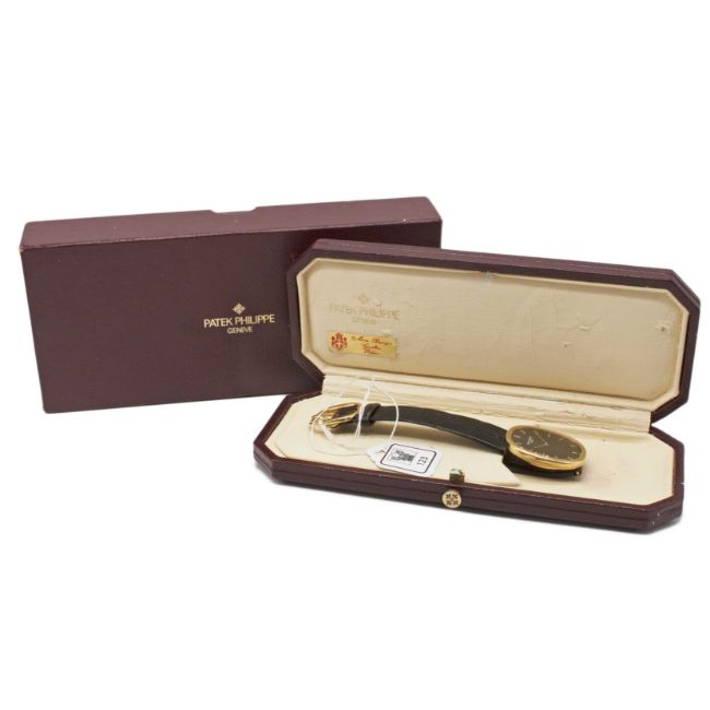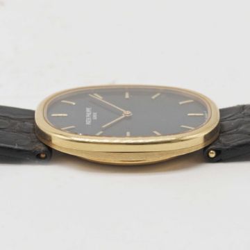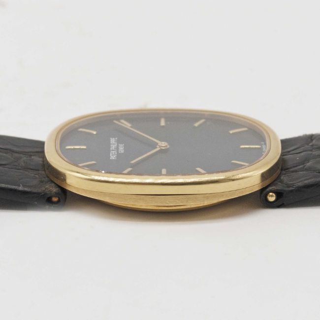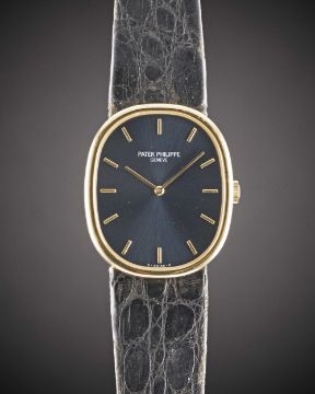 A GENTLEMAN'S 18K SOLID GOLD PATEK PHILIPPE ELLIPSE WRIST WATCHCIRCA 1980s, REF. 3848 WITH BLUE SIGMA DIAL, ACCOMPANIED BY PATEK PHILIPPE BOXMovement: 18J, manual wind, cal. 215, signed Patek Philippe, numbered 1,3xx,xxx.Case: Approx. 32mm by 27mm, snap back, signed Patek Philippe & Co, 18k hallmarks, numbered 2,9xx,xxx, Patek Philippe crown.Strap: Original Patek Philippe leather strap & 18k solid gold Ellipse pin buckle.CONDITION REPORTDial: Original dial in excellent condition.Movement: Running at present.Case: In excellent condition, with some light scratches due to general use.Strap/Bracelet: In fair condition, pin buckle in excellent condition.The timekeeping and accuracy of this watch has not been tested, therefore cannot be guaranteed.