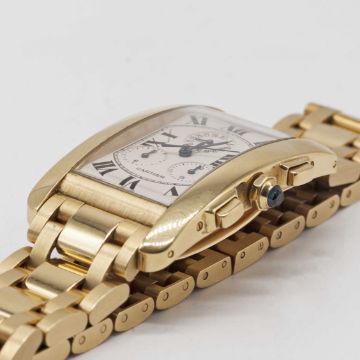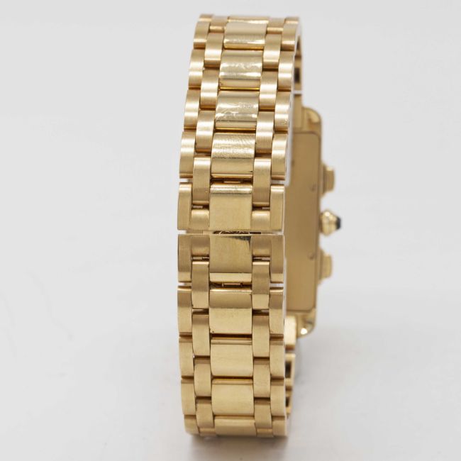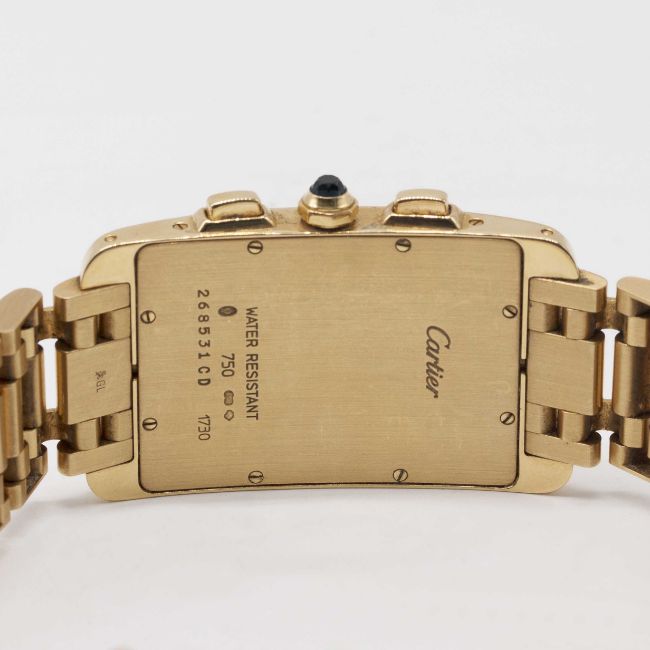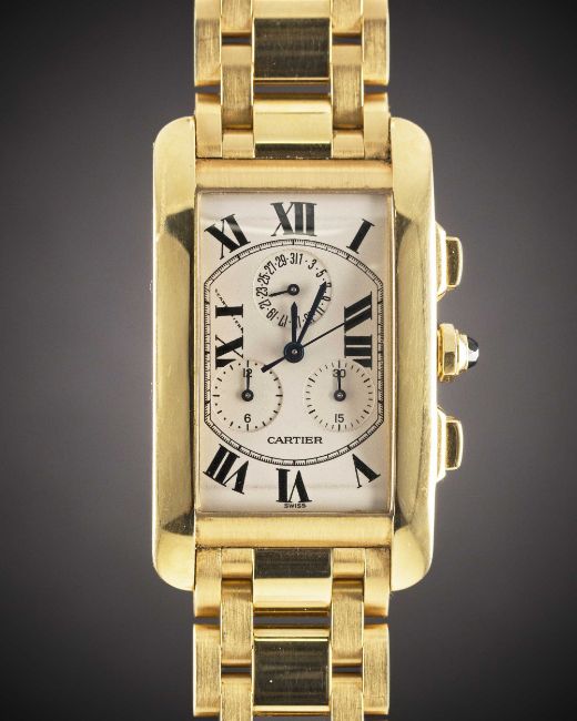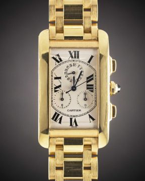 A GENTLEMAN'S 18K SOLID GOLD CARTIER TANK AMERICAINE CHRONOGRAPH BRACELET WATCHDATED 2003, REF. 1730 WITH ORIGINAL BOX & PAPERSMovement: Quartz, signed Cartier.Case: Approx. 45mm by 26mm, curved case, signed Cartier, numbered, 18k hallmarks, sapphire crown.Bracelet: Original 18k solid gold Cartier bracelet.CONDITION REPORTDial: Original dial in very good condition, showing some small signs of age.Movement: Running at present.Case: In excellent condition, with some light scratches due to general use.Strap/Bracelet: In excellent condition, with some light scratches due to general use.The timekeeping and accuracy of this watch has not been tested, therefore cannot be guaranteed.
