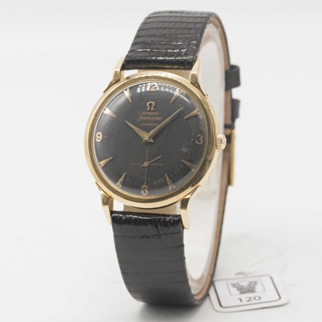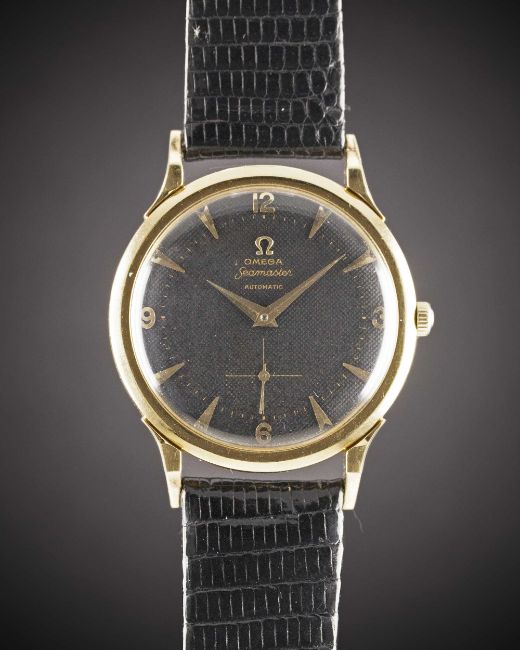 A GENTLEMAN'S 18K SOLID GOLD OMEGA SEAMASTER AUTOMATIC WRIST WATCHCIRCA 1952, WITH RARE BLACK "HONEYCOMB" DIALMovement: 17J, "bumper" automatic, cal. 342, signed Omega Watch Co, numbered 13,xxx,xxx. Case: Diameter approx. 35mm, "claw" lugs, snap back, signed Omega Watch Co, 18k hallmarks, numbered 11,xxx,xxx / 14,xxx, Omega crown.Strap: Leather with gold-plated Omega pin buckle.CONDITION REPORTDial: Original dial in very good condition, showing small signs of age.Movement: Running at present.Case: In very good condition, with some light scratches due to general use.Strap/Bracelet: In excellent condition.The timekeeping and accuracy of this watch has not been tested, therefore cannot be guaranteed.