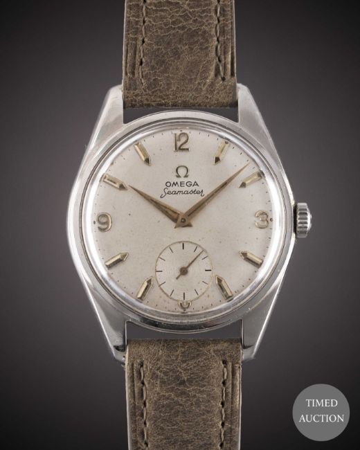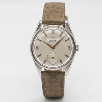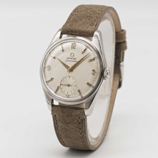 Case: Diameter approx. 36mm, "waterproof" snap back, signed Omega Watch Co, initials inscribed on case back & dated 1960, Omega crown.