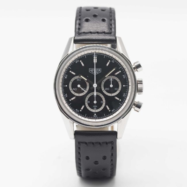 Strap: Perforated leather with Heuer by TAG Heuer re-edition pin buckle.